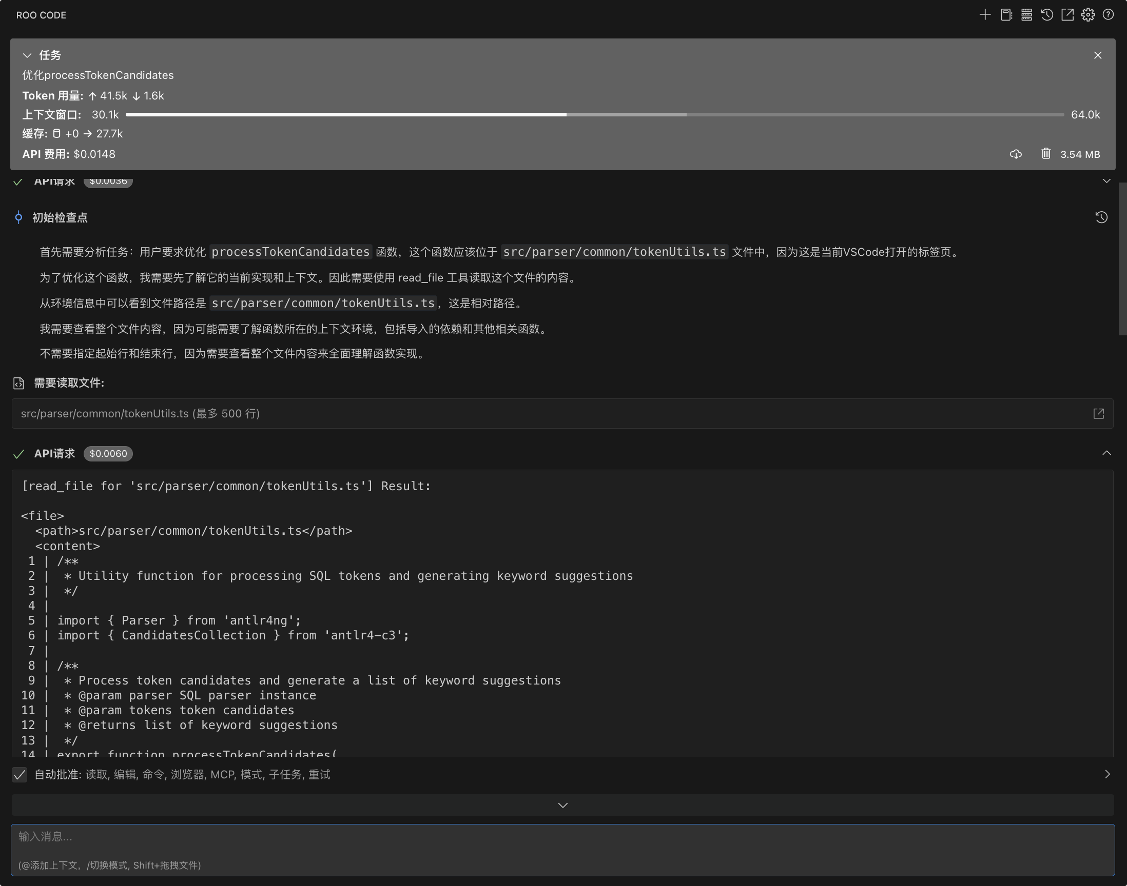 但是, Roo Code 对上下文大小优化比较有限,缺少对代码库索引的支持,没几次对话可能就超出上下文大小了。