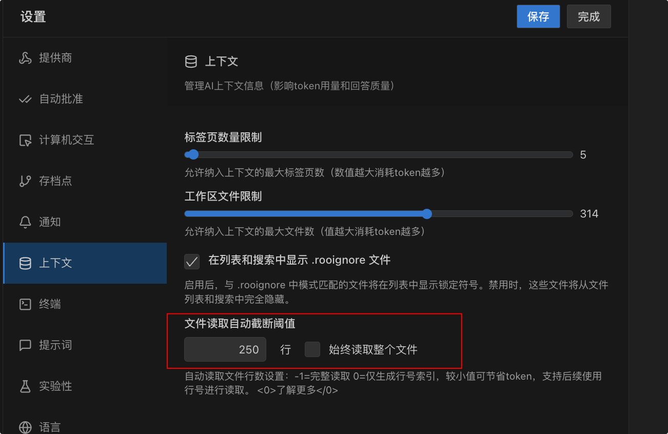 在中大型项目中,建议配置文件读取行数截断,否则会将整个文件的代码都传给大模型。