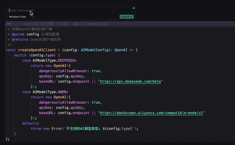 早期的智能补全只能补齐光标后面的内容(利用 inlineCompletion 实现的),而不能修改或者删除已有代码。为了打破这个限制,更多形态的智能补全被挖掘出来。