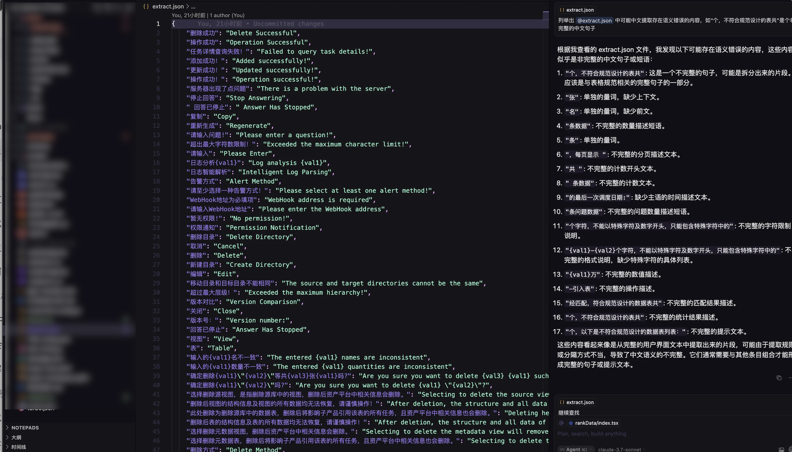 在进行产品国际化进程时,需要对产品中现有的所有中文进行提取,但基于AST提取出来的中文可能由于字符串拼接等原因,完整的语句会被拆分到多个子片段中,导致翻译困难, 而所有需要排查的文案多达3000行,因此需要借助大模型进行不符合语义化的内容排查。