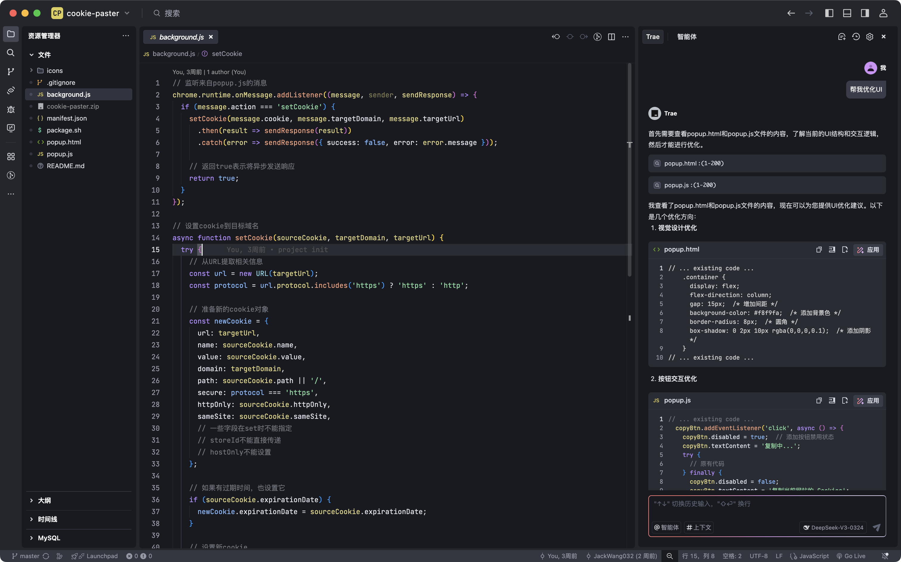 直接在代码块中快速唤起一个弹窗以针对当前选中的代码进行修改, 提供轻量级的上下文,并且是没有对话记忆的,往往做一些非常明确的工作,如针对某个函数进行优化或者国际化翻译。