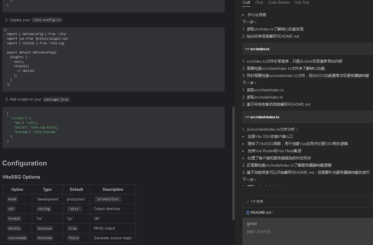 总结:这是一个用于Vite的SSG(静态站点生成)库,支持Vue 3,提供多页面和单页面两种模式。项目采用TypeScript编写,使用pnpm管理依赖,构建工具为unbuild。示例项目展示了不同场景的使用方式。