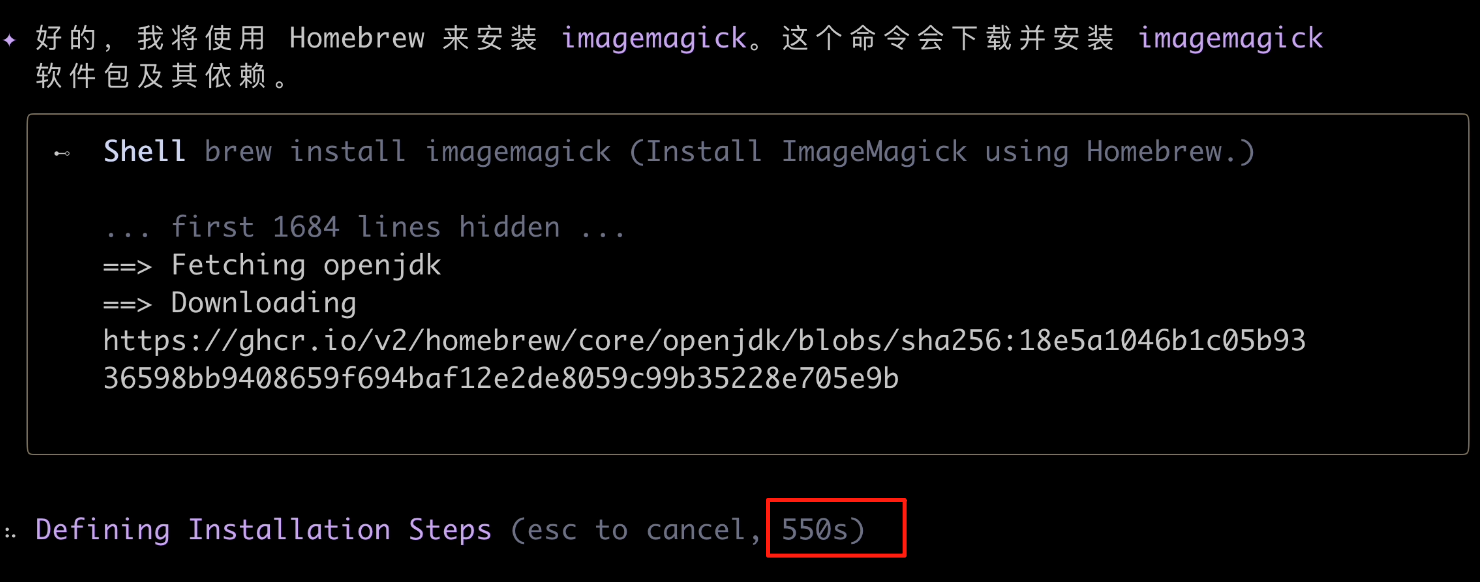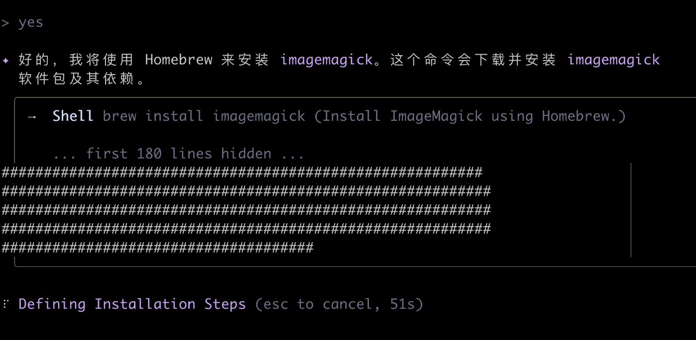 然后 AI 发现无法处理图片,要下载一个图片处理工具,然后它说要利用 Mac 上的软件包管理工具来安装,同意即可:
