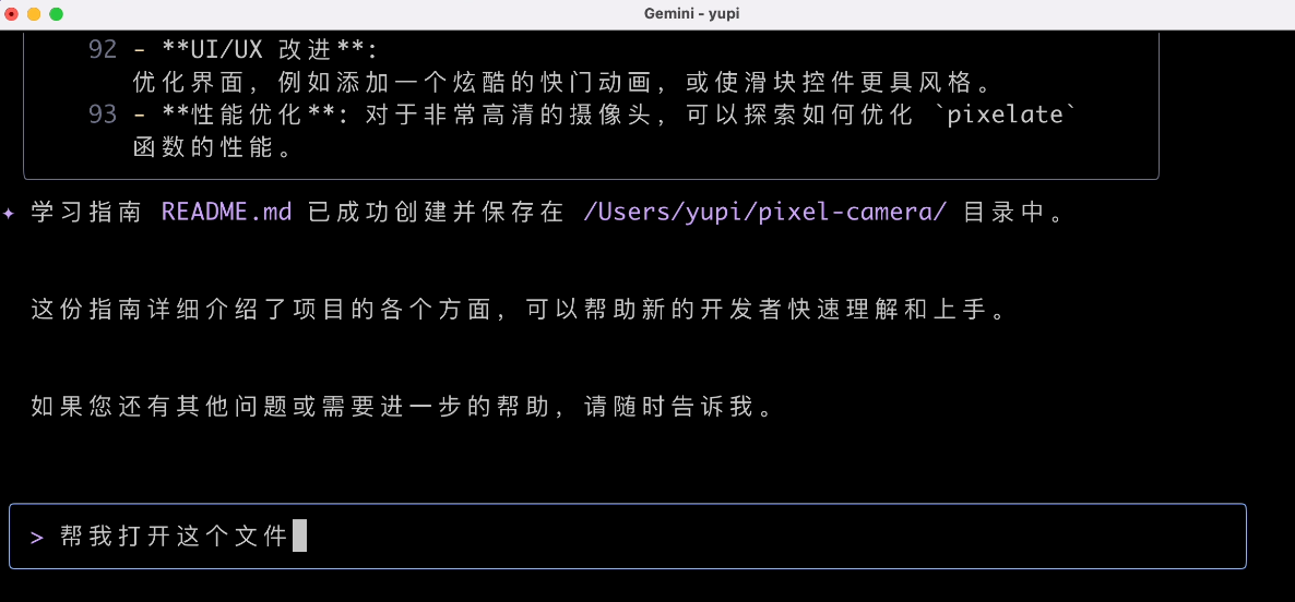 由于 AI 有上下文,它直接 get 到了我想让他分析哪个项目,然后很快生成了一个项目文档。