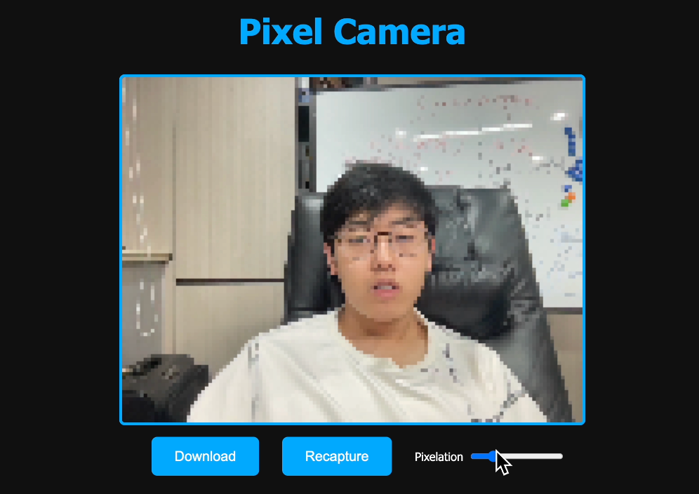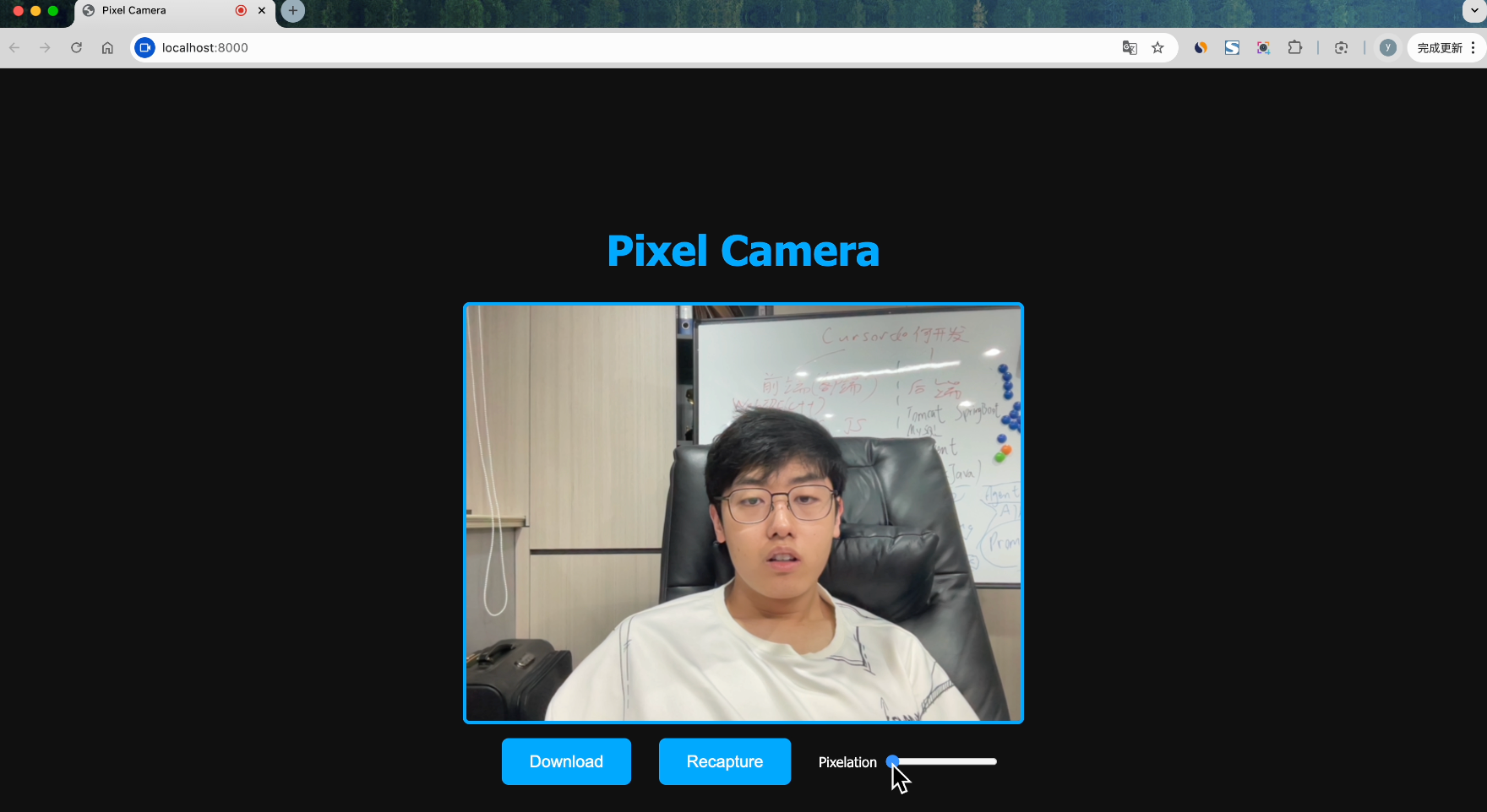 请帮我制作一个网站,能够调用摄像头进行拍照,并将照片转为像素风,支持下载,要求界面简洁炫酷