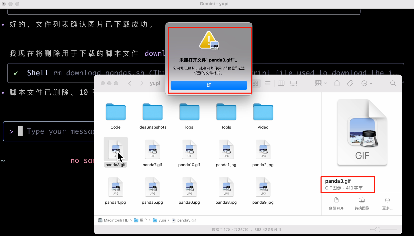 尺寸确实放大了,格式也转换成功了,GIF 也成功生成了。终于顺利完成了一次任务,还不戳。通过这种方式处理本地图片确实是要比网页端的 AI 应用方便很多。