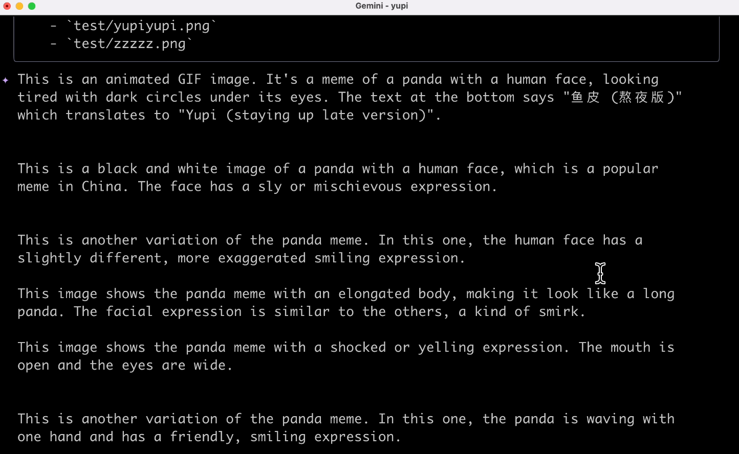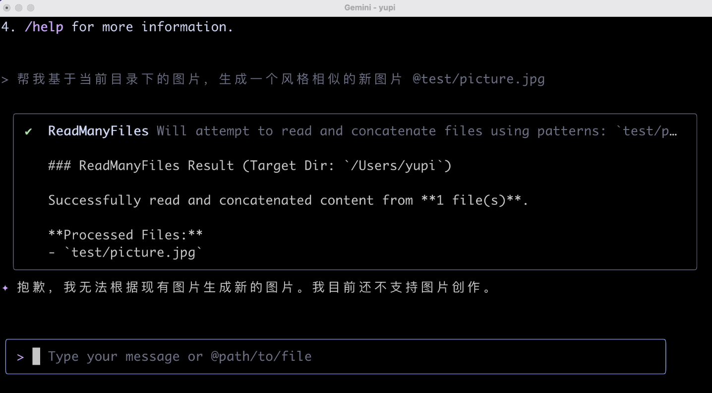 Gemini CLI 背后用的应该是 Gemini 2.5 Pro 模型,是具有原生多模态输入能力的,也就是说能识图,但是并不能创作图片,包括创作音频和视频应该都是通过第三方大模型(或者 MCP 工具实现的)。