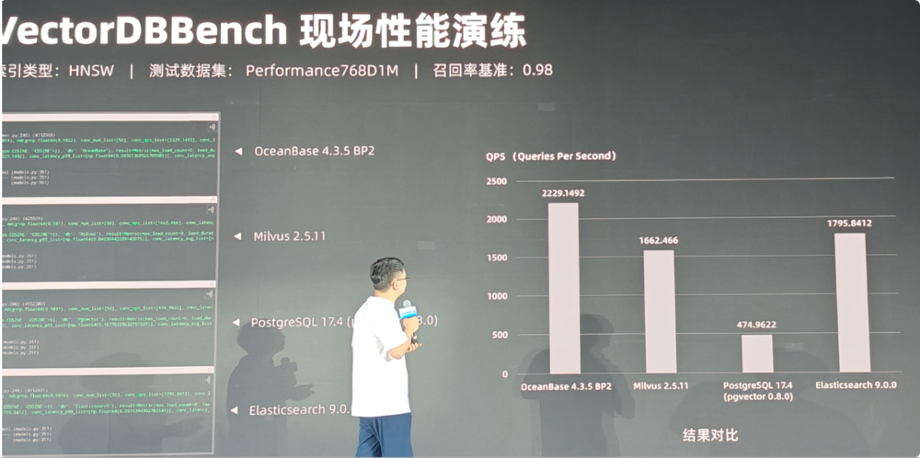 对于 AI 应用开发而言,OceanBase 具备出色的向量检索性能,下图为向量数据库查询 Benchmark 压测的结果,来自于 OceanBase 2025开发者大会现场测试。从图中可以看出,OceanBase 每秒执行的向量查询次数远高于其他的主流向量数据库。
