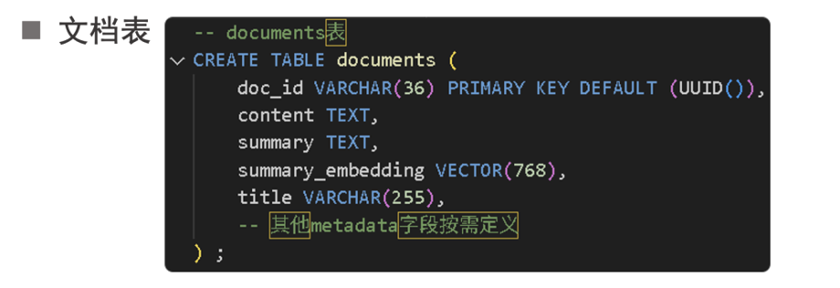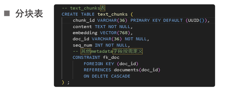 下面是我们利用 OceanBase 在处理流程中的操作细节,首先我们需要把文档的分块二级索引存储在 OceanBase 的二维表中。对于文档表,我们存储文档 ID、文档内容、文档总结、文档总结嵌入向量、文档标题;对于分块表,我们存储分块 ID、分块内容、分块嵌入向量、分块所属的文档 ID。