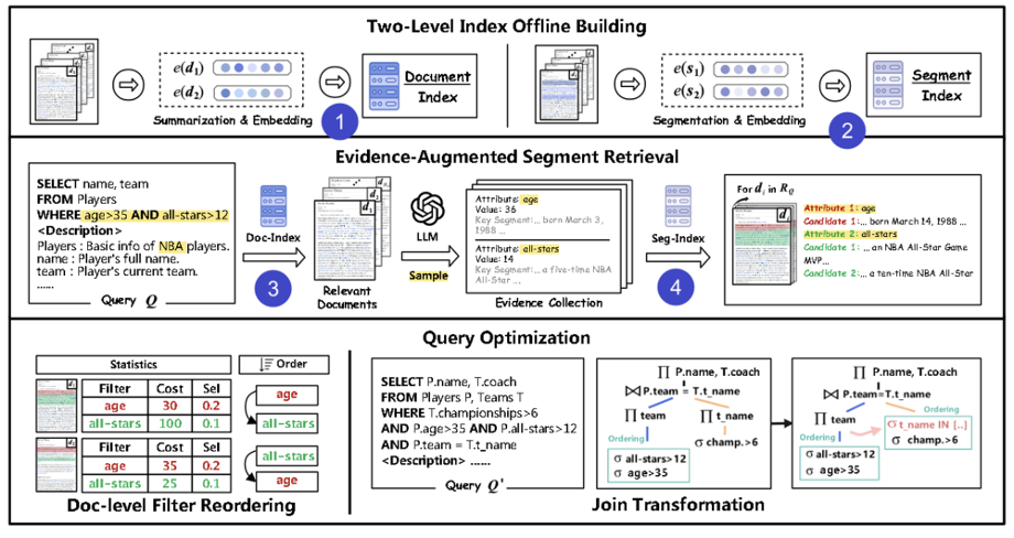 近年来,DocETL、Evaporate等系统尝试改进传统做法,提出了“先filter再抽取属性”的优化路径和工作流设计方法,致力于减少无效抽取操作。