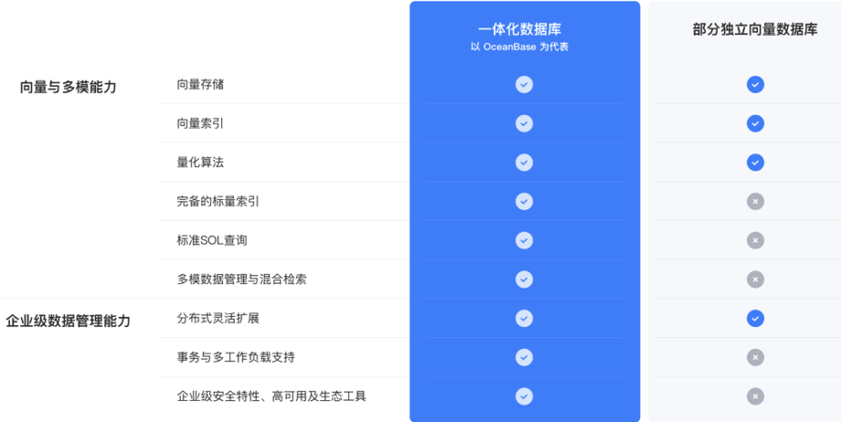 相比于传统的单一存储范式,OceanBase 是一体化数据库,它将不同存储范式的优点集成在一起,较市面上独立的向量数据库能更好地应对非结构化文档存储和分析的挑战。