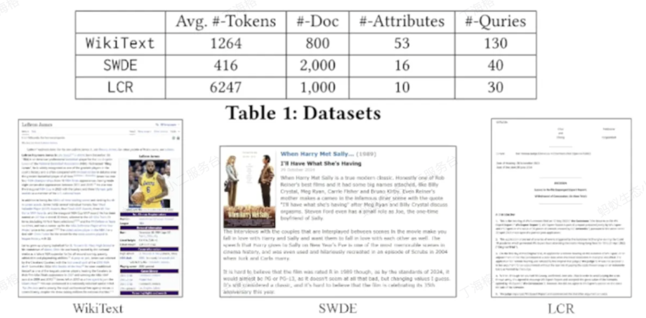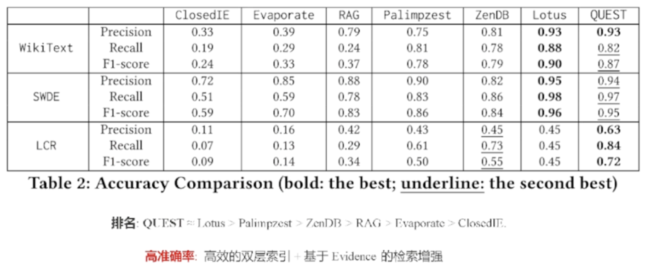 为了测试QUEST 系统的效果,我们在 WikiText、SWDE、LCR 几个数据集上进行了实验,其中 LCR 是法律数据集、SWDE 是影视相关的数据集,然后与其他领域内比较领先的非结构化文档分析系统进行了比较,发现 QUEST 系统在准确率、成本、延迟方面都明显优于其他系统。
