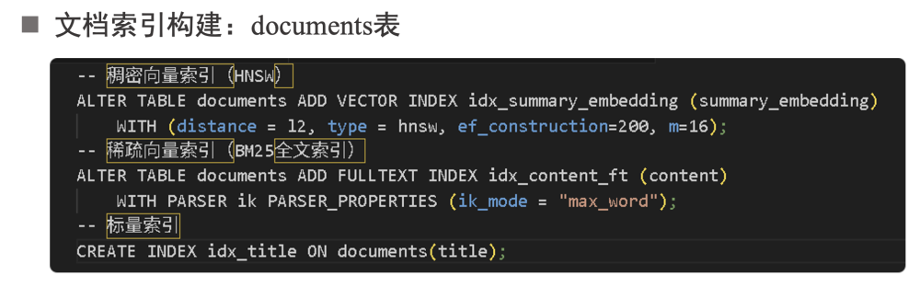 - 对 summary_embedding 建立稠密向量索引(hnsw 语义- 相似度)。