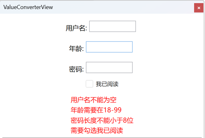<TextBlock Style="{StaticResource ErrorStyle}" Text="年龄需要在18-99" Visibility="{Binding ElementName=age,Path=Text,Converter={StaticResource ageToVisibilityConverter}}"/>