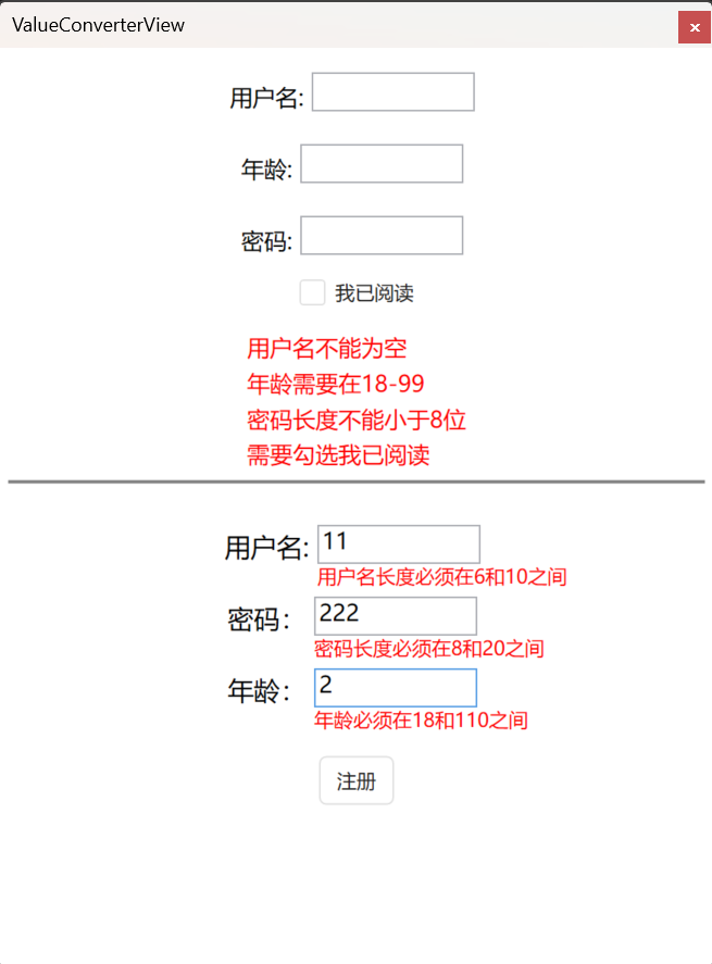 第三步:引用命名空间:xmlns:conv=”clr-namespace:ValueConverters;assembly=ValueConverters”,并使用ValueConverterGroup定义每个不一样的验证,并显示,如果按照规则填好,就取消错误提示。