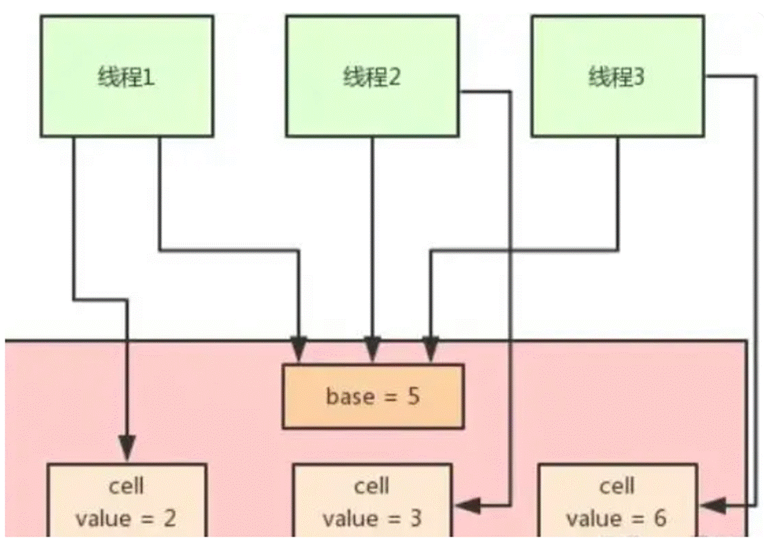 - 这时,让大量的线程分别去对不同Cell内部的value值进行CAS累加操作,这样就把CAS计算压力分散到了不同的Cell分段数值中了!