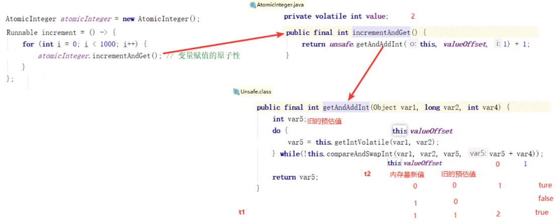 AtomicInteger类当中其内部会包含一个叫做UnSafe的类,该类可以保证变量在赋值时的原子操作;
