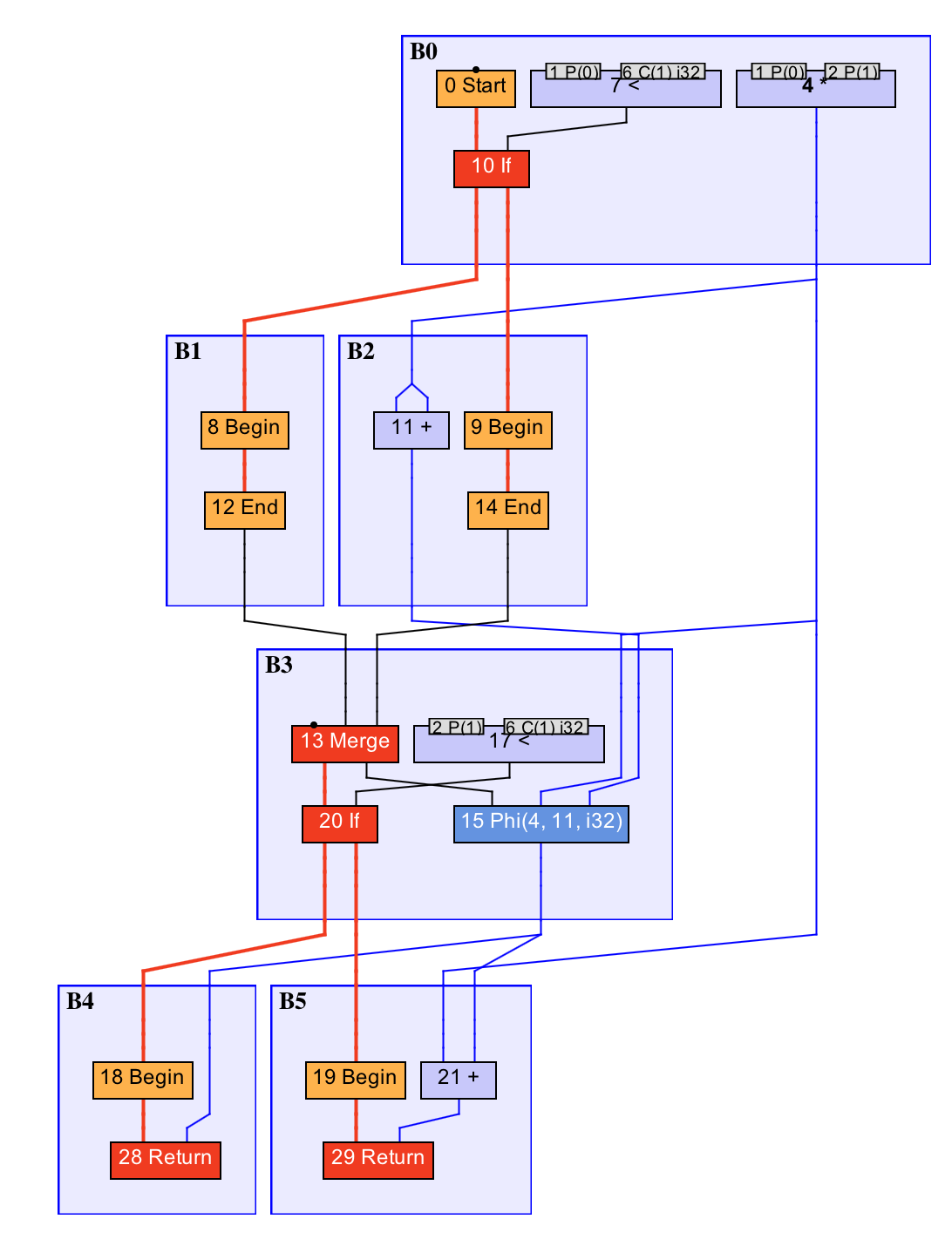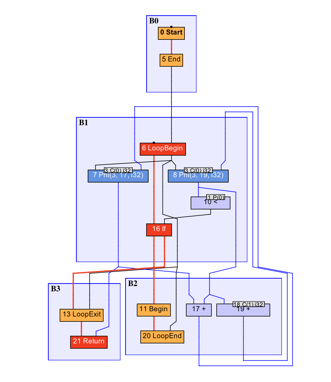 0 号 Start 节点是方法入口,21 号 Return 节点是方法出口。红色加粗线条为控制流,蓝色线条为数据流,而其他颜色的线条则是特殊的控制流或数据流。被控制流边所连接的是固定节点,其他的皆属于浮动节点。若干个顺序执行的节点将被包含在同一个基本块之中,如图中的 B0、B1 等