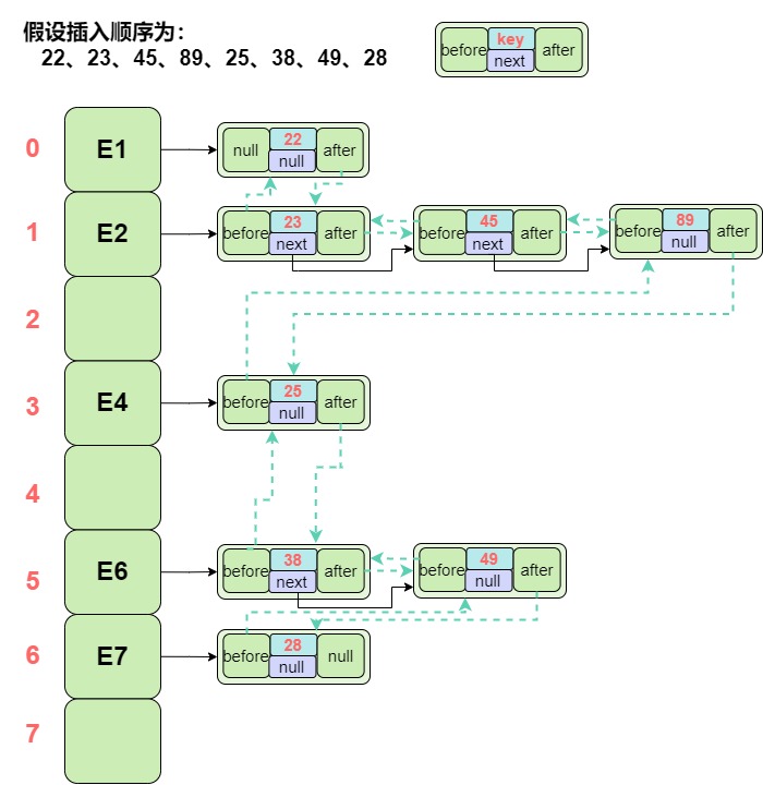 图中信息含义: 当前节点信息只显示key值,next为下一个映射冲突节点;before为双链结构的上一节点,after为双链结构的下一节点;绿色虚线是整个LinkedHashMap的双链结构的连接关系。