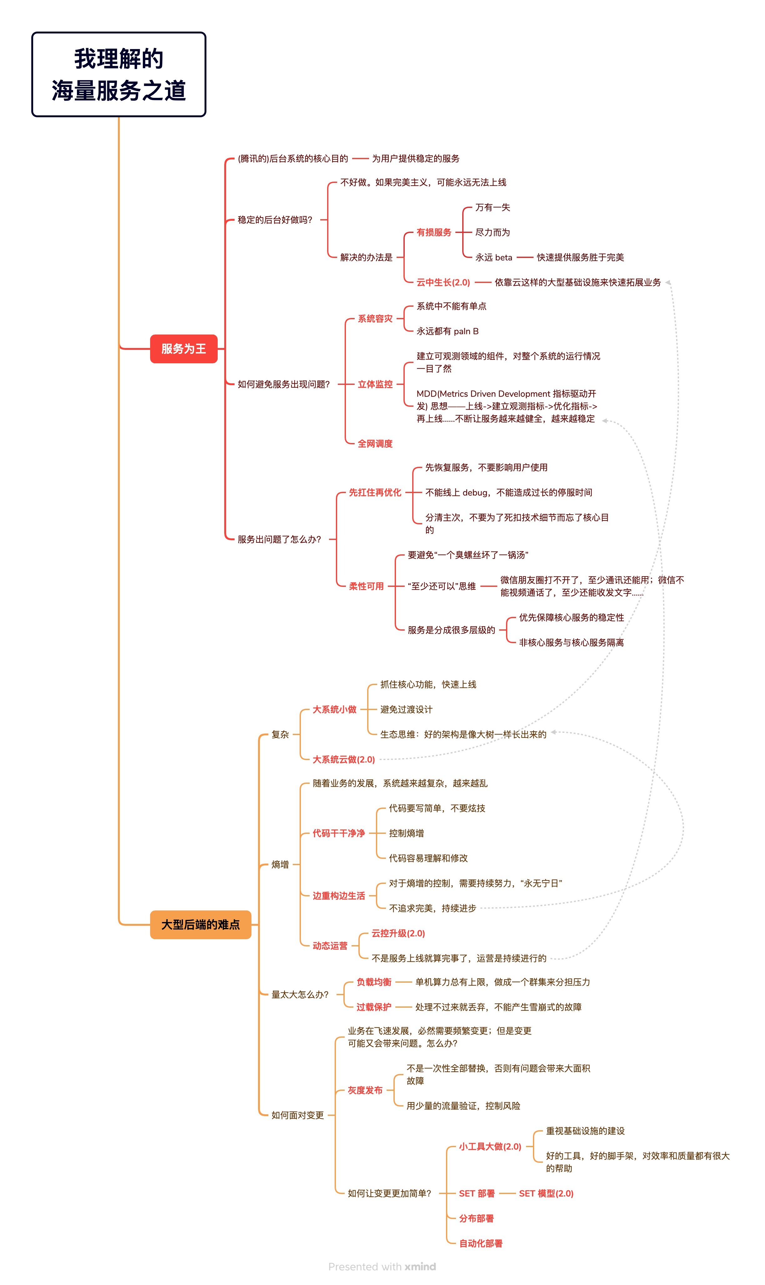 - 大约在 20 年前,腾讯的 CTO 张志东(内部尊称他为Tony大师兄)提出了后台服务器开发领域的“海量服务价值观”(或叫做“海量服务之道”)。在 2016 年左右,为了配合腾讯云的技术战略,又提出了“海量服务之道 2.0”,对之前的理念做了增补和延展。我认为“海量服务价值观”是服务器开发领域了不起的方法论和思考框架,用如此简洁和直达要点的方式,指导我们如何去做好服务器开发的工作。