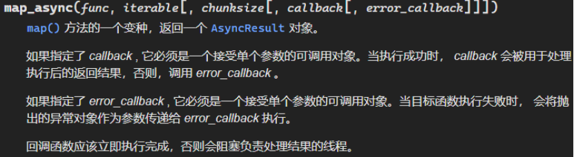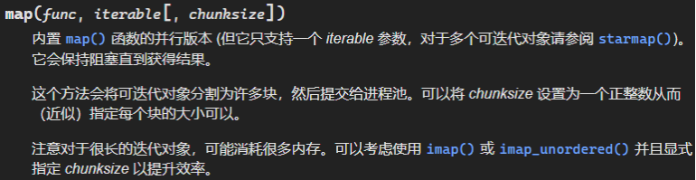 在得到结果之前一直阻塞,此方法将可迭代的数据的每一个元素作为进程池的一个任务来执行。