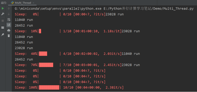 如下为运行结果,可以看到进程池每处理完一个任务,就会调用一次 tqdm
