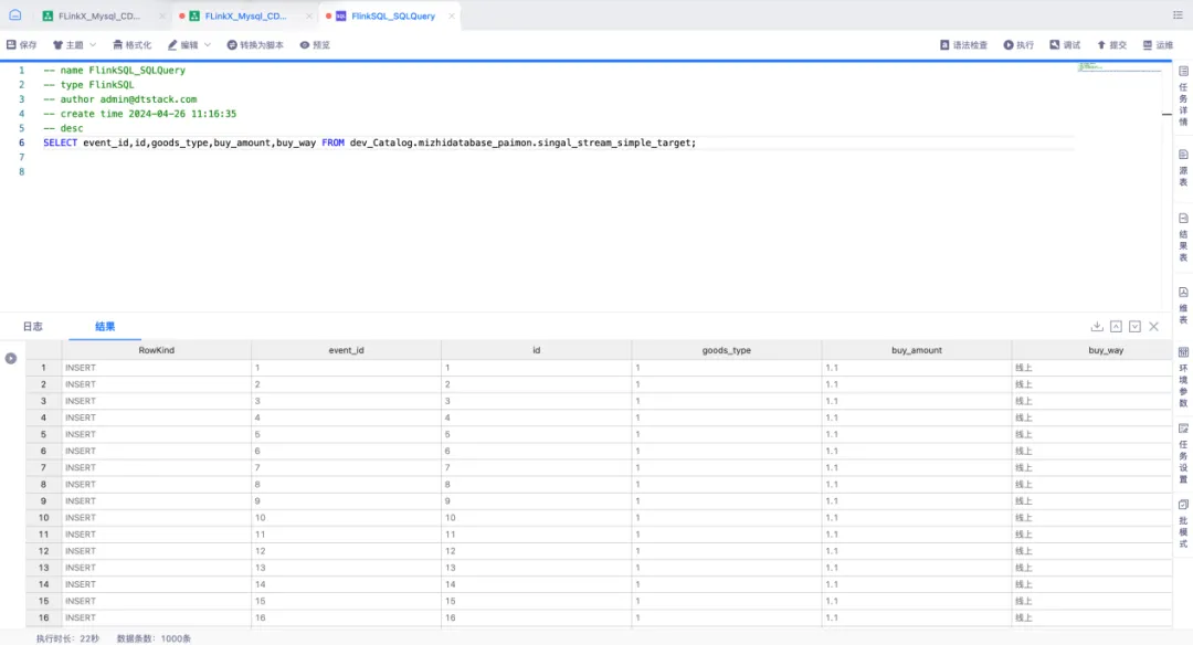 通过实时平台中 FlinkSQL 任务所提供的功能,对 Paimon 表进行查询并插入数据。利用 FlinkSQL 的 SqlQuery 功能构建 Select 查询语句,并采用流模式实时查询 Paimon 表,以采集插入数据的情况。