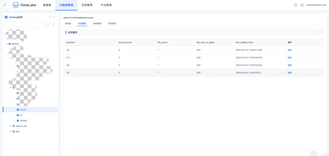 快照记录了一个表在某一特定时间点的状态。用户能够借助最新的快照获取一个表的最新数据。利用时间旅行,用户还可以通过较早的快照访问表的先前状态。快照概览展示了当前表的所有快照、最新 snapshot,支持手动创建标签并在列表中展示引用关系,同时支持快照的删除和回滚操作。