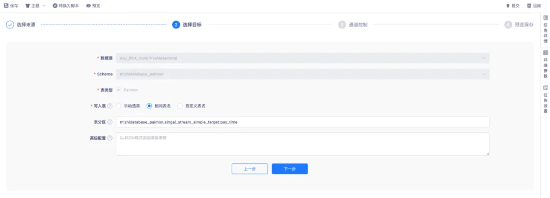 目标源通过 HiveMetastore 方式配置目标 Paimon 表。写入表的方式具有一定灵活性,支持手动选择表。对于上游存在多表写入同一下游表的场景,有一定要求,必须保证上下游表结构保持一致。