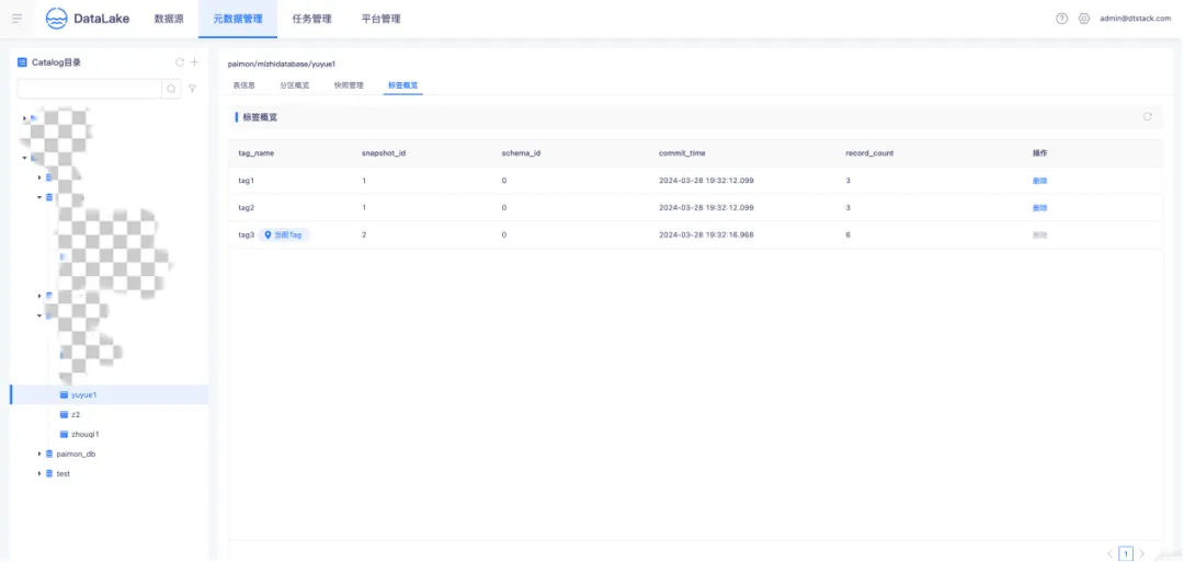 标签是对快照的引用,能够基于某个特定快照创建。用户能够在特定的快照上添加标签,如此一来,即便快照过期且被删除,只要标签仍然存在,就能够通过标签访问到相应的数据。标签概览展示了表的所有历史标签版本、标签与快照的引用关系,并且支持标签的删除操作。