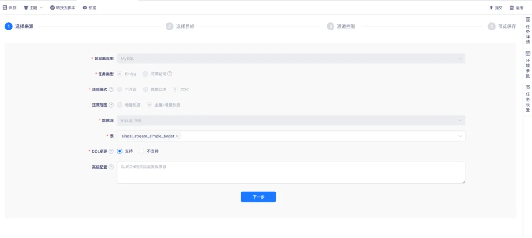 首先,对数据库表进行全表快照读取,生成数据的一致性快照,以同步来源表的历史全量数据。在全量快照读取完成后,会自动切换至增量模式,对数据库的增量变化进行采集。表选择的方式多样,支持整库同步、分库分表同步、单表选择同步,同时也支持通过正则的方式选择表。