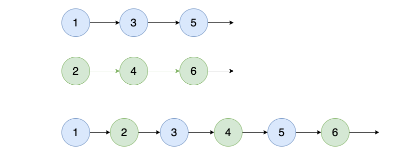 如输⼊{1,3,5} , {2,4,6} 时,合并后的链表为{1,2,3,4,5,6} ,所以对应的输出为{1,2,3,4,5,6} ,转换过程如下图所示: