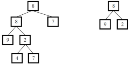 假如给定A 为{8,8,7,9,2,#,#,#,#,4,7} , B 为{8,9,2} , 2 个树的结构如下,可以看出B是A 的⼦结构: