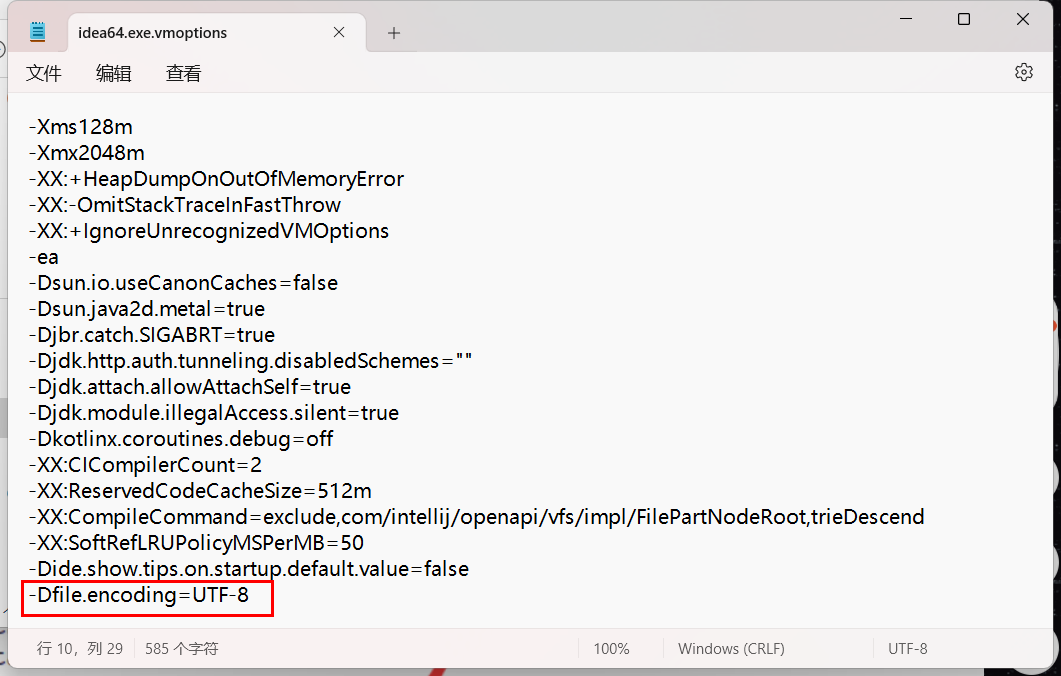 然后我点开了IDEA所在目录bin文件下的idea64.exe.vmoptions文件,在最后一行添上-Dfile.encoding=UTF-8,重新打开IDEA后就可以正常显示了
