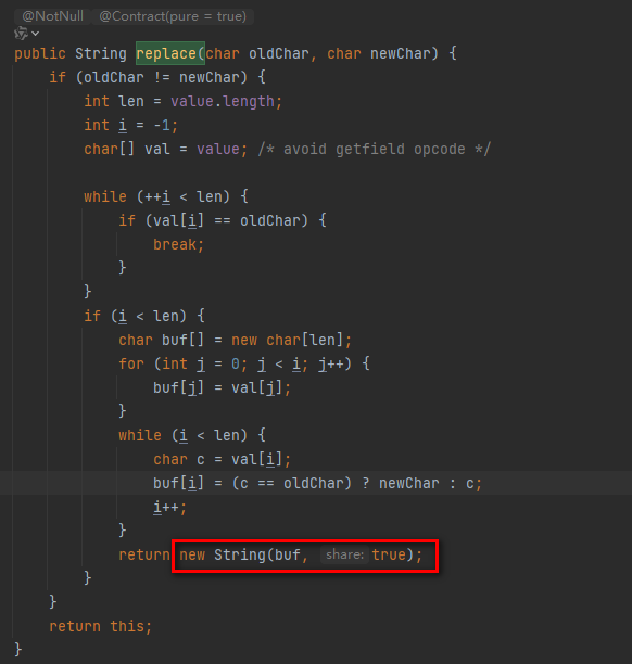 由截图源码可知String类的replace方法的返回新new的一个String对象。