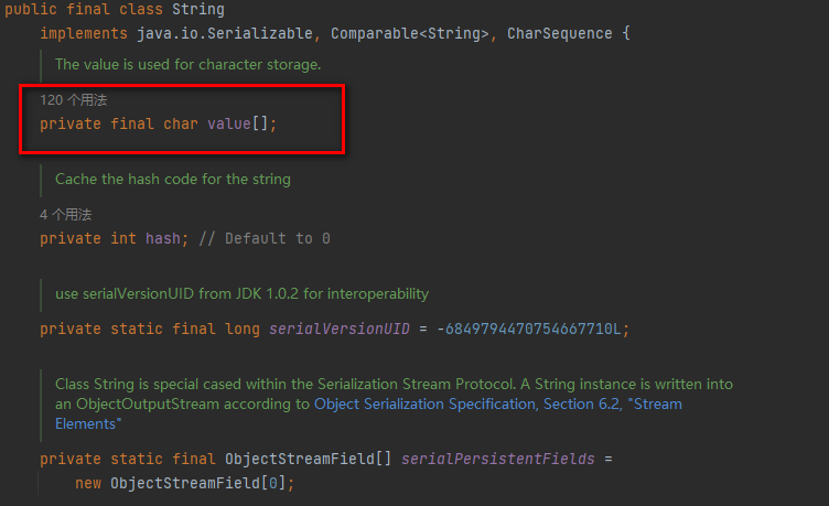 从源码截图中可以看出String 类的声明,从源码里面看String里面实际上是用的一个 char 数组来存储的字符(JDK9+ 已改为 byte数组),