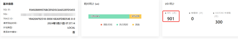 OCP:通过OCP-SQL诊断功能,发现该时间点TOPSQL中无明显慢SQL,通过与开发沟通得知该场景为高频SQL场景,平均响应时间慢几毫秒均会对业务产生影响,随即确定问题SQL。发现其并无相关索引问题呈现。 ODC:将问题SQL在ODC执行查询其实际执行计划,定位问题发现SQL存在较多RPC调用,如图17。