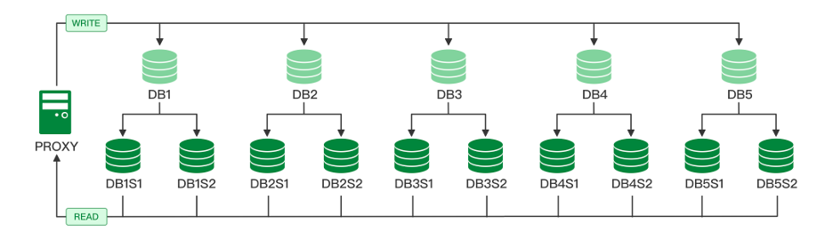 该数据库采用5实例,每个实例10个分库,共50分库;每个实例两从库,使用中间件合并为一逻辑库读写分离。