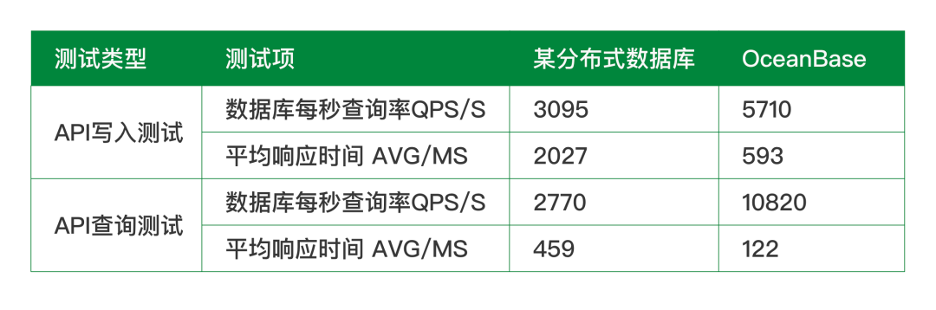 从业务压测结果来看,OceanBase表现更优,对比某分布式数据库,写业务的QPS是其2倍,查询业务的QPS是其4倍;但延迟仅为其1/4。