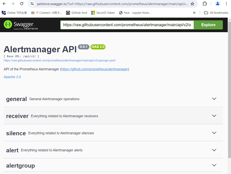 从图中可以看到Alertmanager 自身也提供了API服务,通过访问网址:https://petstore.swagger.io/?url=https://raw.githubusercontent.com/prometheus/alertmanager/main/api/v2/openapi.yaml 可以直接看到其提供了哪些API接口服务,如下图5-2-10所示。