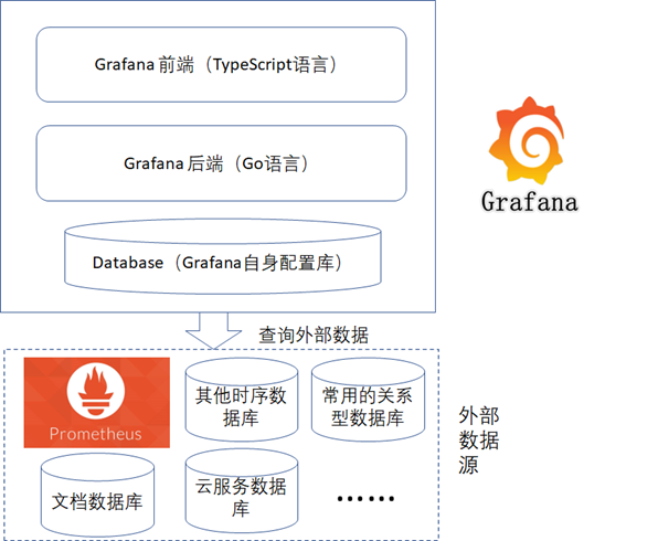 Grafana 同样也是采用Go语言作为核心的底层开发语言,其总体技术实现架构如下图5-2-15所示,从图中可以看到Grafana包含了前端、后端、以及数据库三个部分。