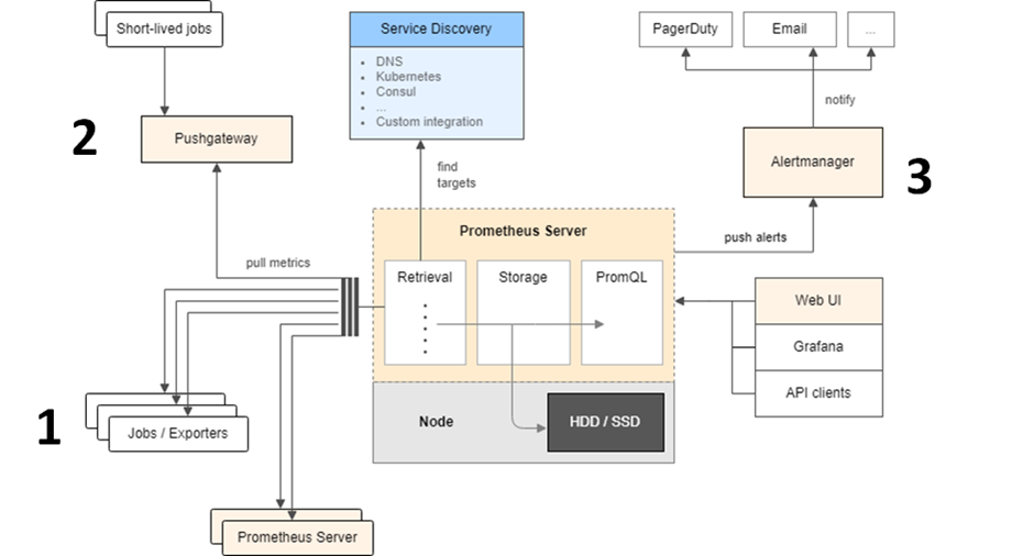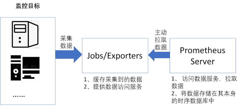 - Jobs/Exporters: 监控数据采集的工具,一般需要独立部署,如下图5-2-4所示,主要负责采集数据,并且提供数据访问服务给Prometheus Server来主动拉取数据。