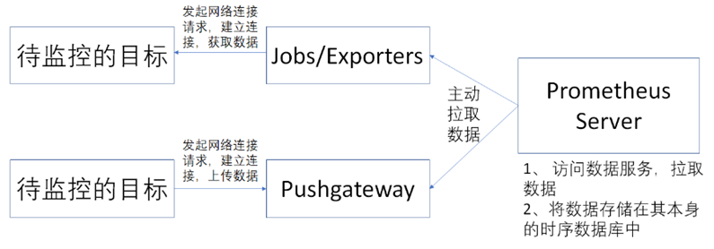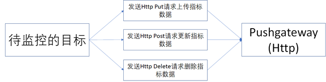 - Pushgateway:同样也是监控数据采集的工具并且需要独立部署,和Exporters的区别在于,Exporters是自己主动去待监控的目标上获取数据,而Pushgateway是自己提供了一个通用的数据接收服务,待监控的目标需要自己通过Pushgateway提供的数据接收服务,将自身的监控数据上报上来,如下图5-2-6所示。