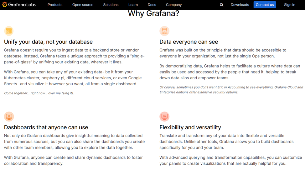 Grafana是一个开源的提供大量图表工具的可视化监控和Dashboard制作工具,通过访问官方网址:https://grafana.com/grafana/ 即可以进入Grafana的官方主页,如下图5-2-13所示。
