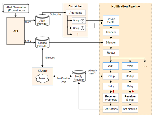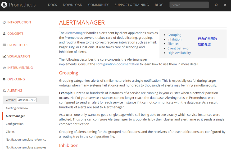 - Alertmanager:配合Prometheus 来做告警规则配置和告警消息通知的一个采用Go语言开发的技术组件,负责对告警消息做去重、分组等处理,然后根据配置的路由规则将告警消息发送到对应的接收器中,比如企业微信、Email、钉钉等。通过访问官方文档网址:https://prometheus.io/docs/alerting/latest/alertmanager/ 可以查看Alertmanager更多的详细介绍,如下图5-2-8所示。