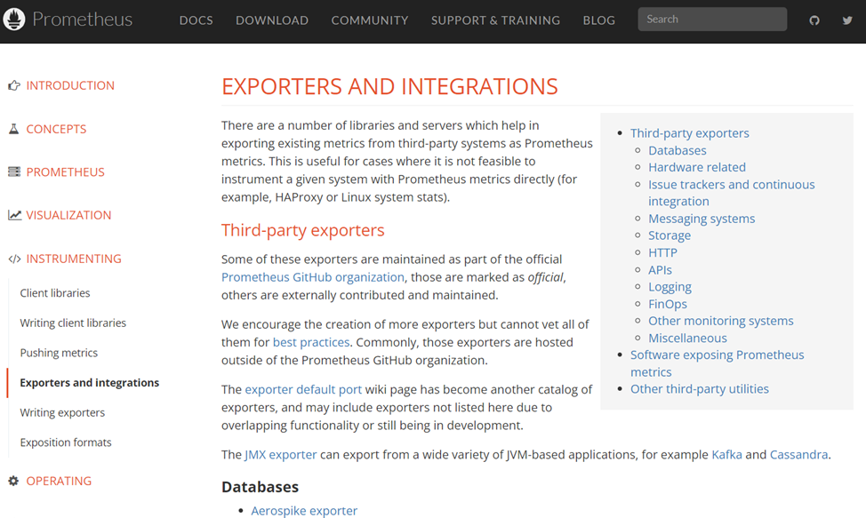 访问Prometheus的官方网址:https://prometheus.io/docs/instrumenting/exporters/ 可以获取到常见的Exporters,如下图5-2-5所示。
