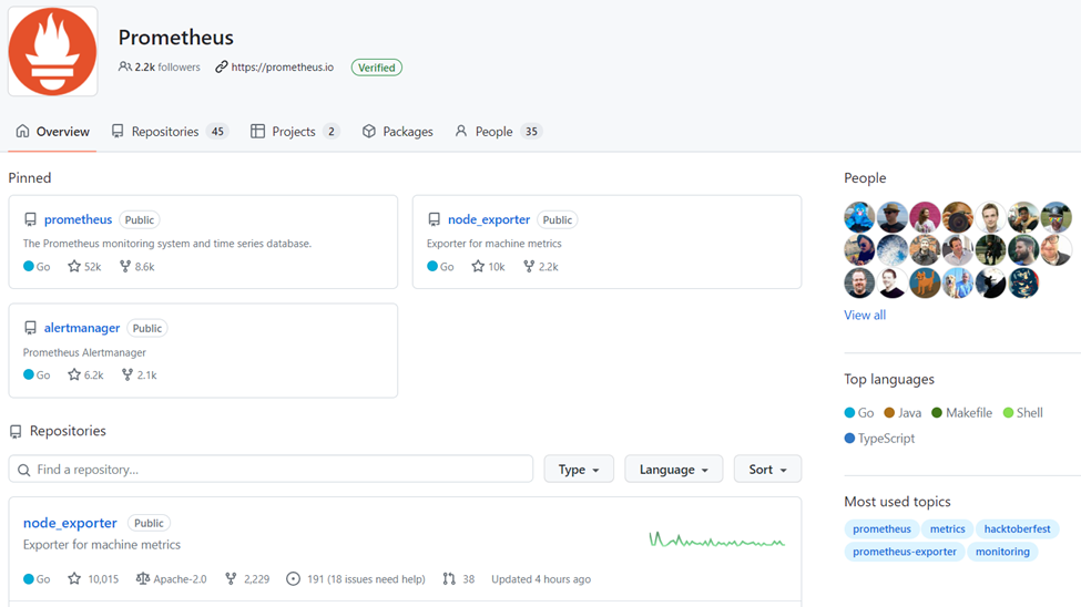 Prometheus的源码是托管在Github中,其Github的源码网址为:https://github.com/prometheus,如下图5-2-2所示,从源码中可以看到Prometheus的核心开发语言是Go,Go是由Google开发的一种编译型语言,Go语言的性能非常好,非常适合直接运行于硬件设备之上。