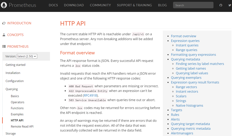 Prometheus 提供了一种其独有的名为的PromQl的SQL查询语言,相关的介绍可以参考官方网址:https://prometheus.io/docs/prometheus/latest/querying/basics/,而且也支持HTTP API接口服务查询,相关的介绍可以参考官方网址:https://prometheus.io/docs/prometheus/latest/querying/api/,如下图5-2-12所示。《数据资产管理核心技术与应用》是清华大学出版社出版的一本图书,作者为张永清等著