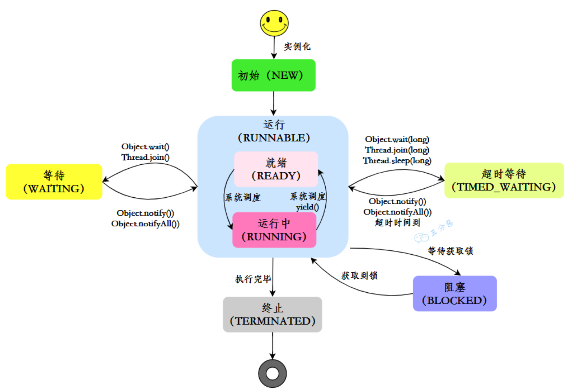 - 等待:线程调用wait()、join()等时,会进入等待状态。必须由notify()或notifyAll()才能唤醒,回到runnable状态