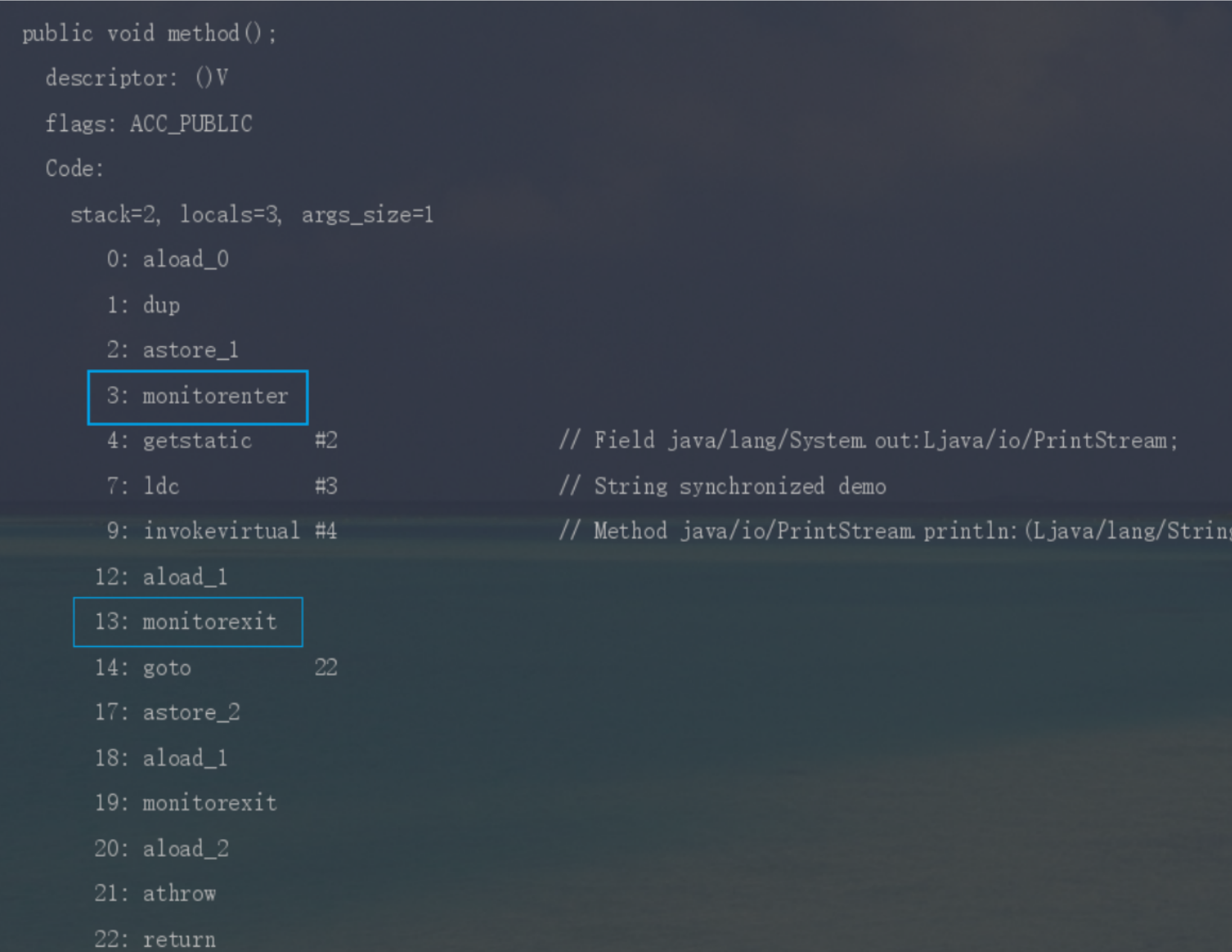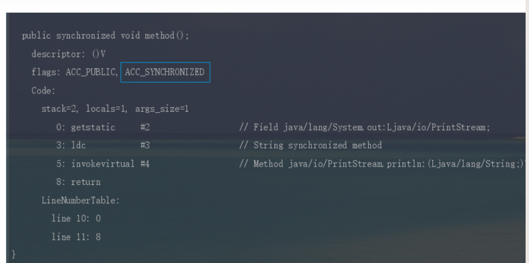 - 修饰方法:JVM在方法表里打上一个标志位ACC_SYNCHRONIZED。在执行时,JVM会检查:如果这个方法有这个标志,调用它时就会自动获取对应对象的Monitor锁–>执行完自动释放锁,不需要显式写lock/unLock。